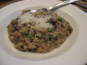 beat a perfect grilled cheese sandwich, I wanted something in a bowl. I settled on Porcini Mushroom Risotto. There is something about the earthy depth of this dish that strikes just the right chord for me. It is also a great way to use that roasted chicken stock you may have made from the roasted chicken recipe a few weeks before. I like to finish it with frozen peas as their bright green color looks wonderful against the caramel color of the finished risotto. If you love mushrooms this is the dish for you. Although you can use your garden variety button mushrooms, I prefer the brown cremini; they go perfectly with the porcini’s. Cooking the dried porcini’s in the roasted chicken broth takes your broth to another level completely.
