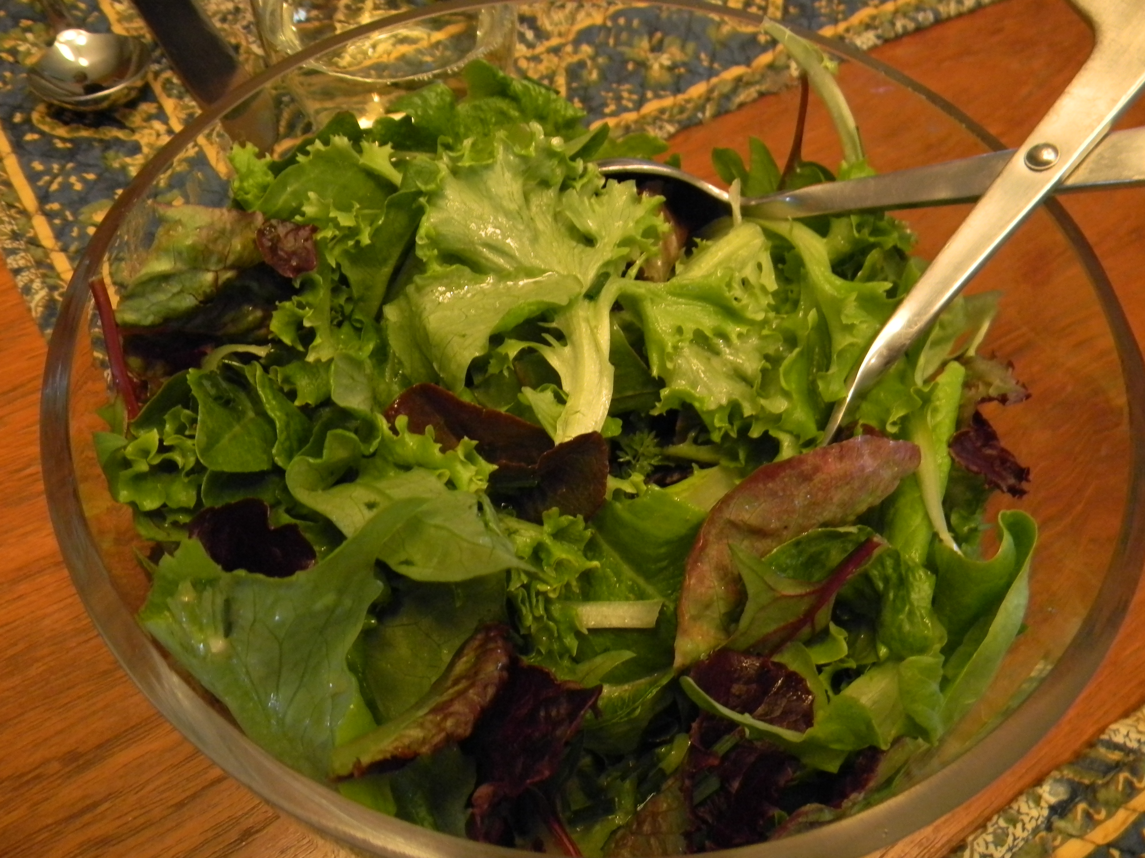 I gather up my hat and coat and close up the hoop-house. Walking home with my bounty, I notice wild chives growing up through the leaves behind the barn; a bright green contrast to the forest floor. I decide to add these to my salad, gently cutting a handful. Entering the kitchen, Val is pulling fresh Ciabatta from the oven. The scent of warm bread surrounds me. I show Val my offering and she smiles her approval, giving me a kiss on the cheek. Our friends Beth and Brian will be arriving soon to share our table. I rinse and spin the salad, then place it in the frig. Next, I decide on the vinaigrette. I look through our condiment shelf and decide on Champagne Vinaigrette. I like to use a glass Dijon mustard jar that I have recycled. The size is ideal and allows me to shake it to my heart’s content until it emulsifies.