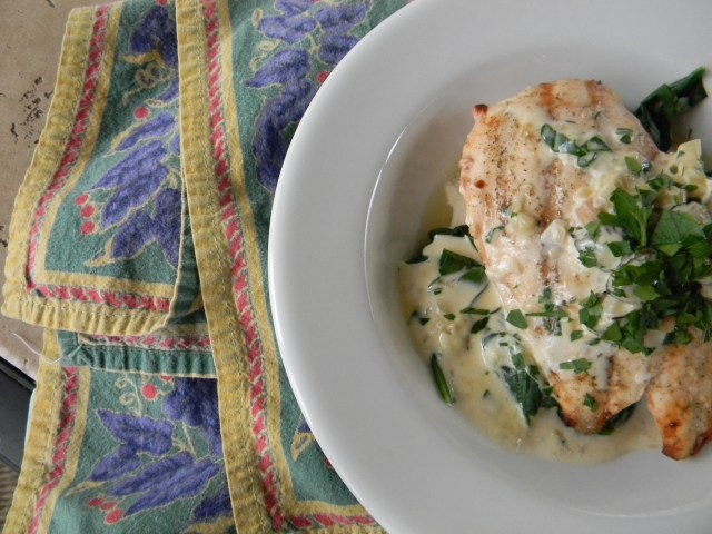 6. Place some spinach in a shallow bowl, top with grilled chicken breast.  Spoon sauce over chicken.  Top with fresh parsley.