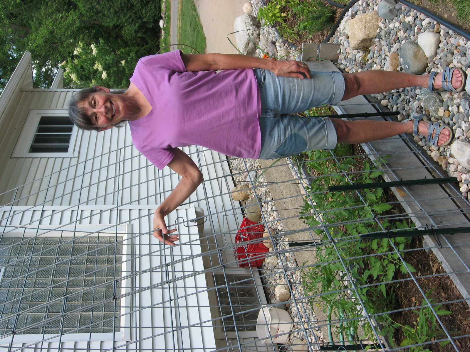 Jelania Hale lives in Kalamazoo.  A long time friend of Lynner’s, she loves the fresh produce that grows here.  Being a vegetarian she particularly enjoys knowing that we are a no-spray farm that uses organic methods.  She thought why couldn’t she grow a few things herself?  Although she lives in a city neighborhood she has designed a small garden that maximizes her minimal space.  Tucked in between two driveways, she has a narrow raised bed that holds tomatoes, basil and garlic.  She has the option of growing vegetables up her ‘cattle fence’ or using it to support her tomatoes.  She can also attach a shade cloth if needed.  The flower beds around her garage and fenced yard are home to beans, lettuce and other herbs.  “I like knowing how my food is grown.  I can’t tell you how often I come out here to water, check on things or just talk to my plants,” say Jelania.  “I enjoy having things visually appealing, so the rocks and potted marigolds add to the esthetics of the raised bed.  It’s amazing what you can do with a small space.”