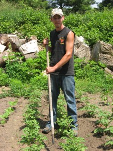 Next we have our farm-hand Zac.  Zac is simply a work-horse!  He plants, weeds and harvests right along side us each day.  You would think he would be absolutely sick of looking at veggies and weeds at the end of the day, but he too wanted to plant a garden, behind the house he rents from us.  For Zac his garden is an effort to take control of his grocery budget and learn how to put up food for winter.  Although Zac has never been an adventurous eater, that doesn’t stop him from planting the things that he does eat like: carrots, peppers, onions and watermelon.  The potatoes are for his mom.  He said, “I particularly like to get up each morning and water my garden.  It’s amazing how many little things you notice; how fast it grows, whether or not there are any pests, that sort of thing.  I  like to share it with Xander (his son) when I have him every other week.  I want him to know there are others things to eat besides hot dogs!”  Zac and I are looking forward to canning salsa together when the tomatoes are on.  “I love your salsa!  I want to make my own!”