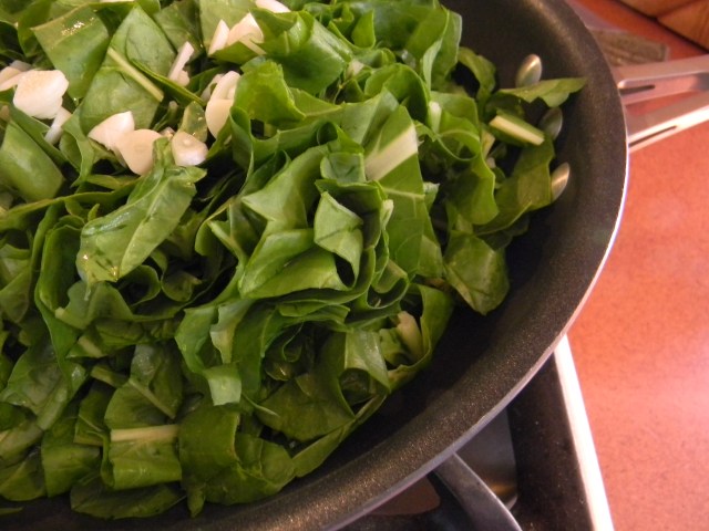 2. Heat oil in large skillet, with tight-fitting lid, over medium-high heat.  Add stems first, sauteing for 2-3 minutes.  Add leaves and garlic, coating with the oil in pan.