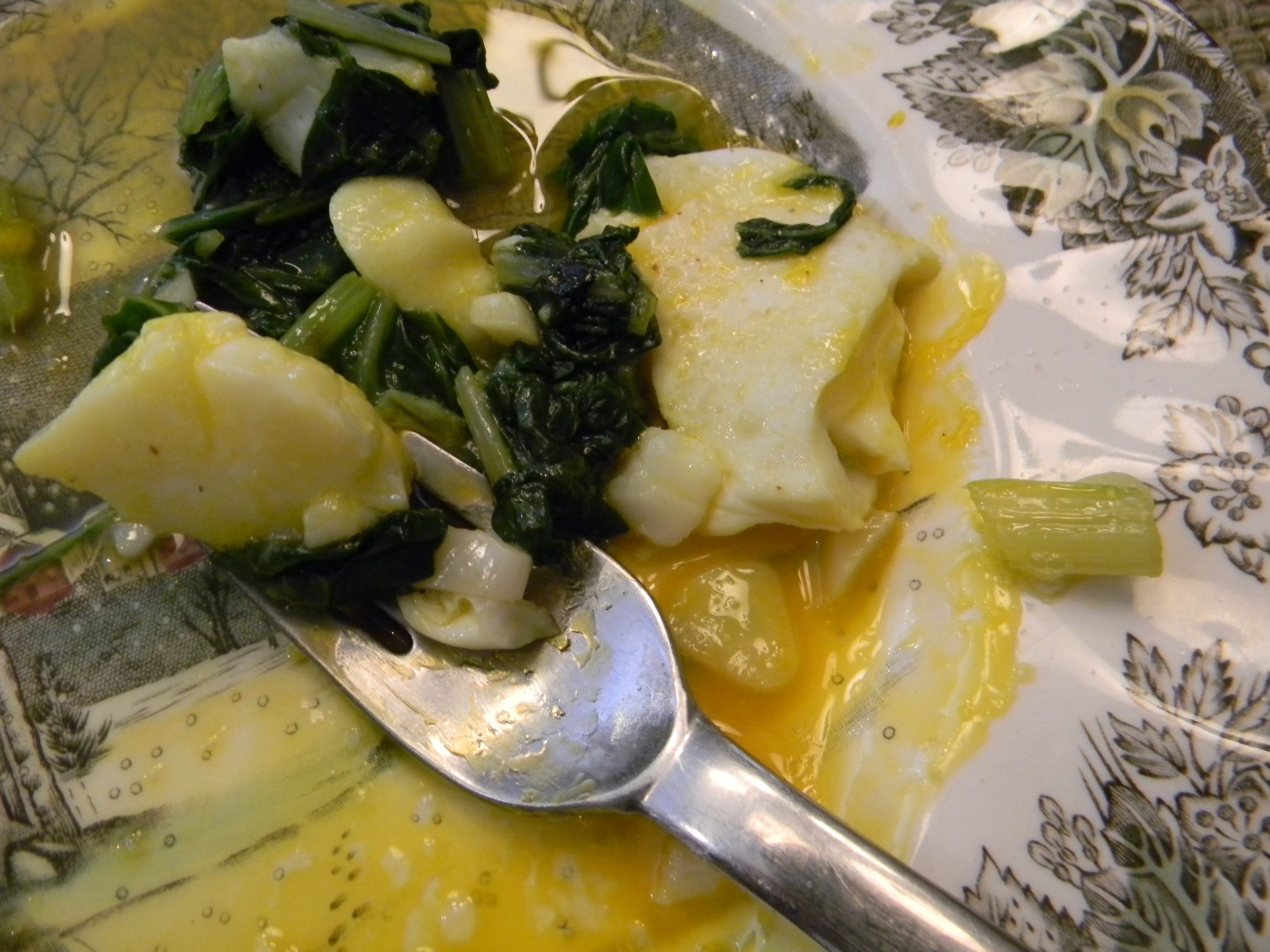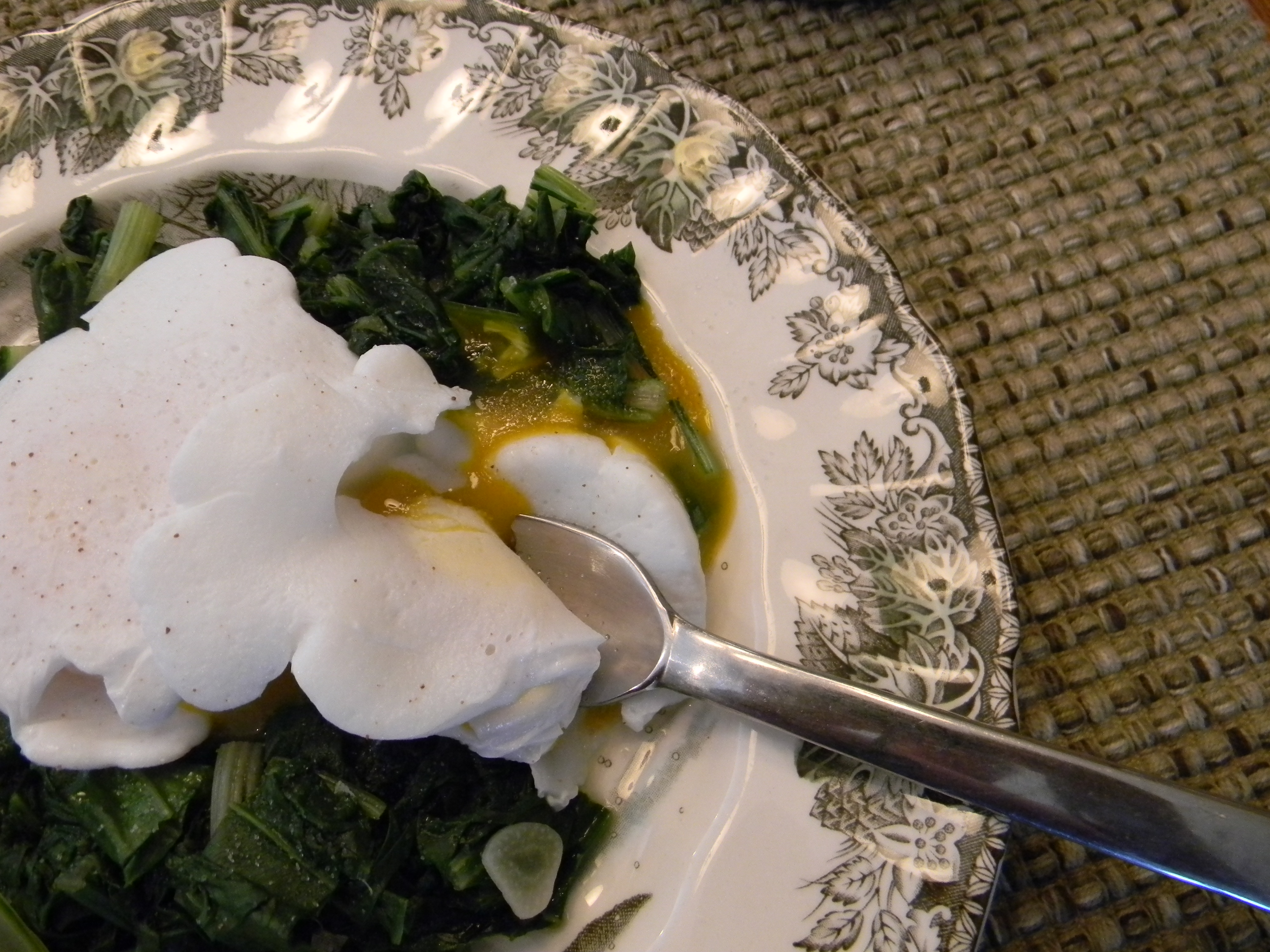 3. Toss until wilted but still bright green.  Divide on two plates, top with poached eggs.