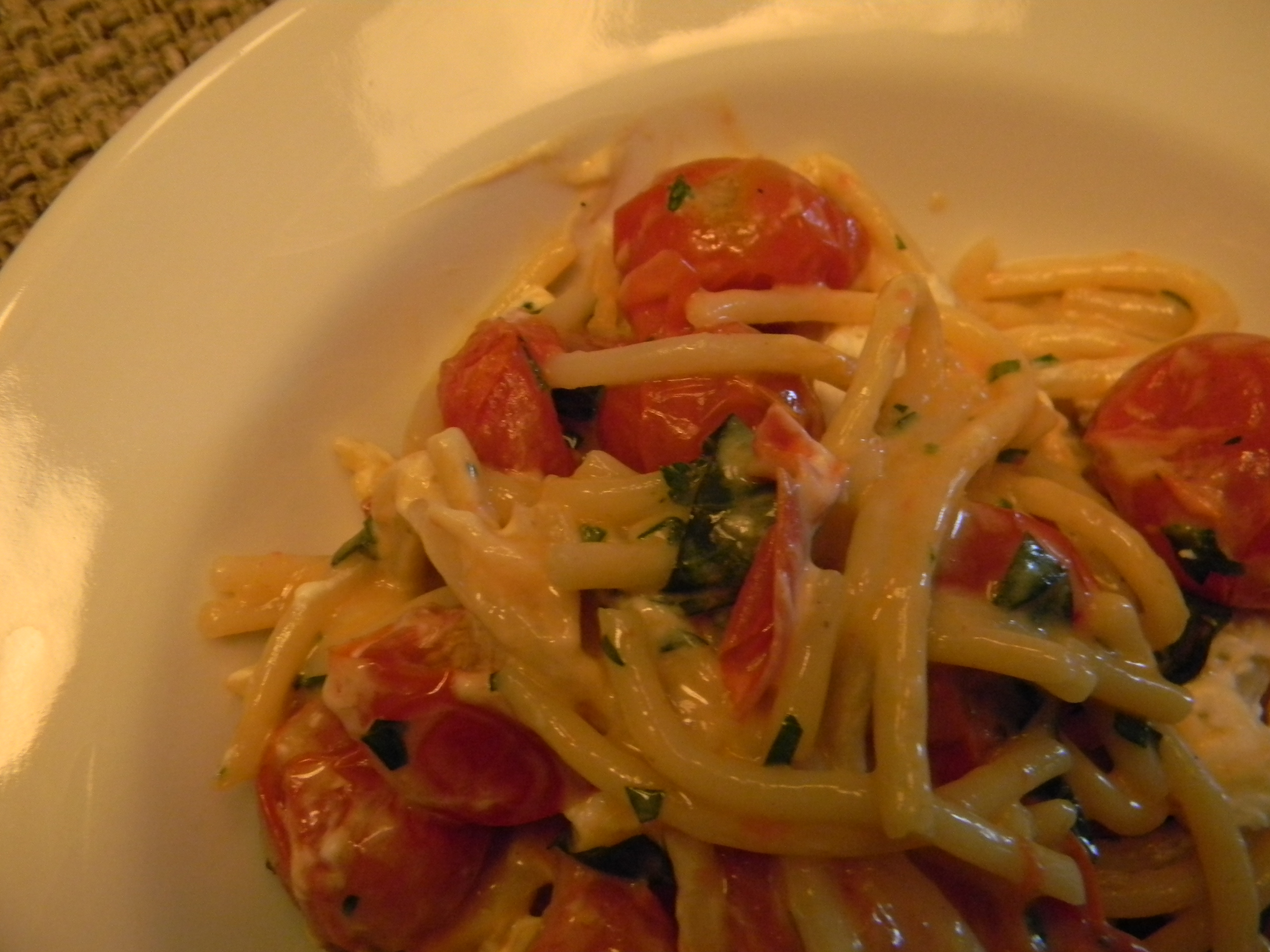5. Add 1/2 of chevre to pasta, along with basil, parsley and remaining cooking water.  Toss thoroughly.