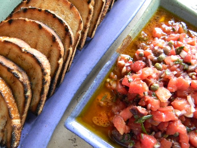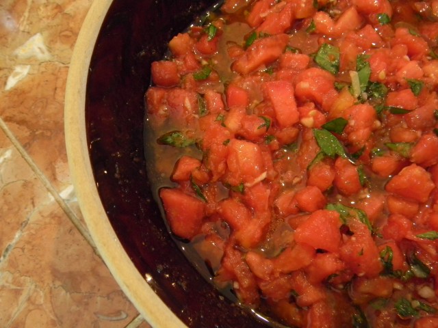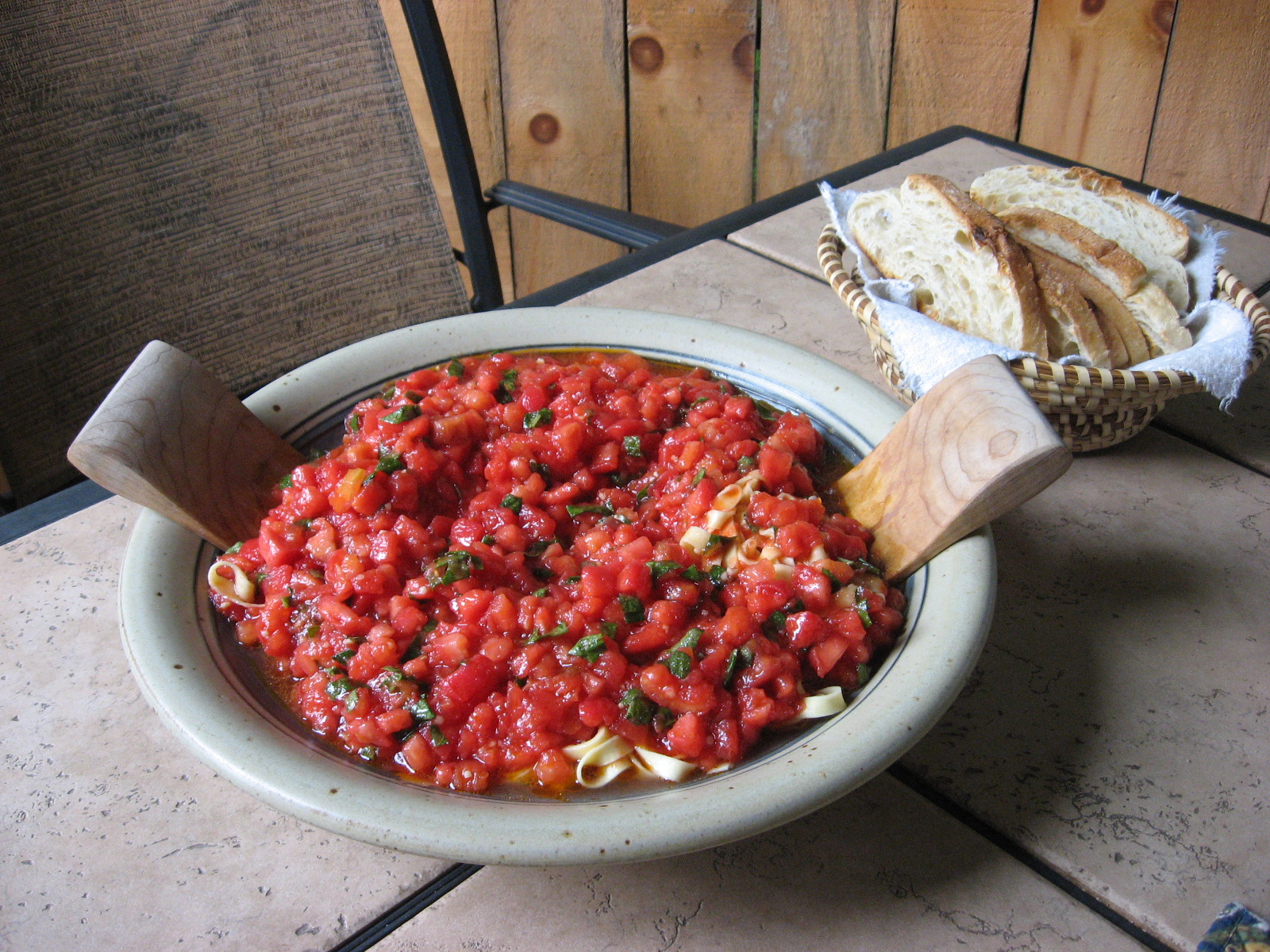 We are roasting, dehydrating, canning sauce and chopped tomatoes, as well as making salsa, to be used during the late fall and winter months.  It is a total labor of love and one of the things that brought us together….our time in the kitchen.  Yet there is one thing that I make each summer that in my view is the reason for the season.  Just the thought of it will put a smile on my face and a song in my heart:  Uncooked Tomato Sauce!  I remember when I made it for the first time, about 25 years ago, how shocked I was by how just five simple ingredients could yield such an incredible flavor, but don’t be fooled! The paste tomatoes are just coming on, so I’ll make it as often as I can squeeze the time in to do it. And since I’m doing something that is a little labor intensive, I’ll make enough to change some into bruchetta.  On the days when the sweat is pouring off my face, I remember this is my reward!