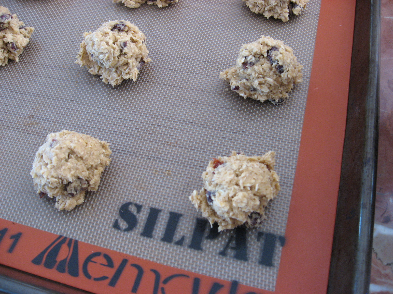4. Use a cookie scoop, placing 12 cookies evenly on mat; alternately use large spoons and form cookies using about 2-3 Tbsp of batter for large cookies.